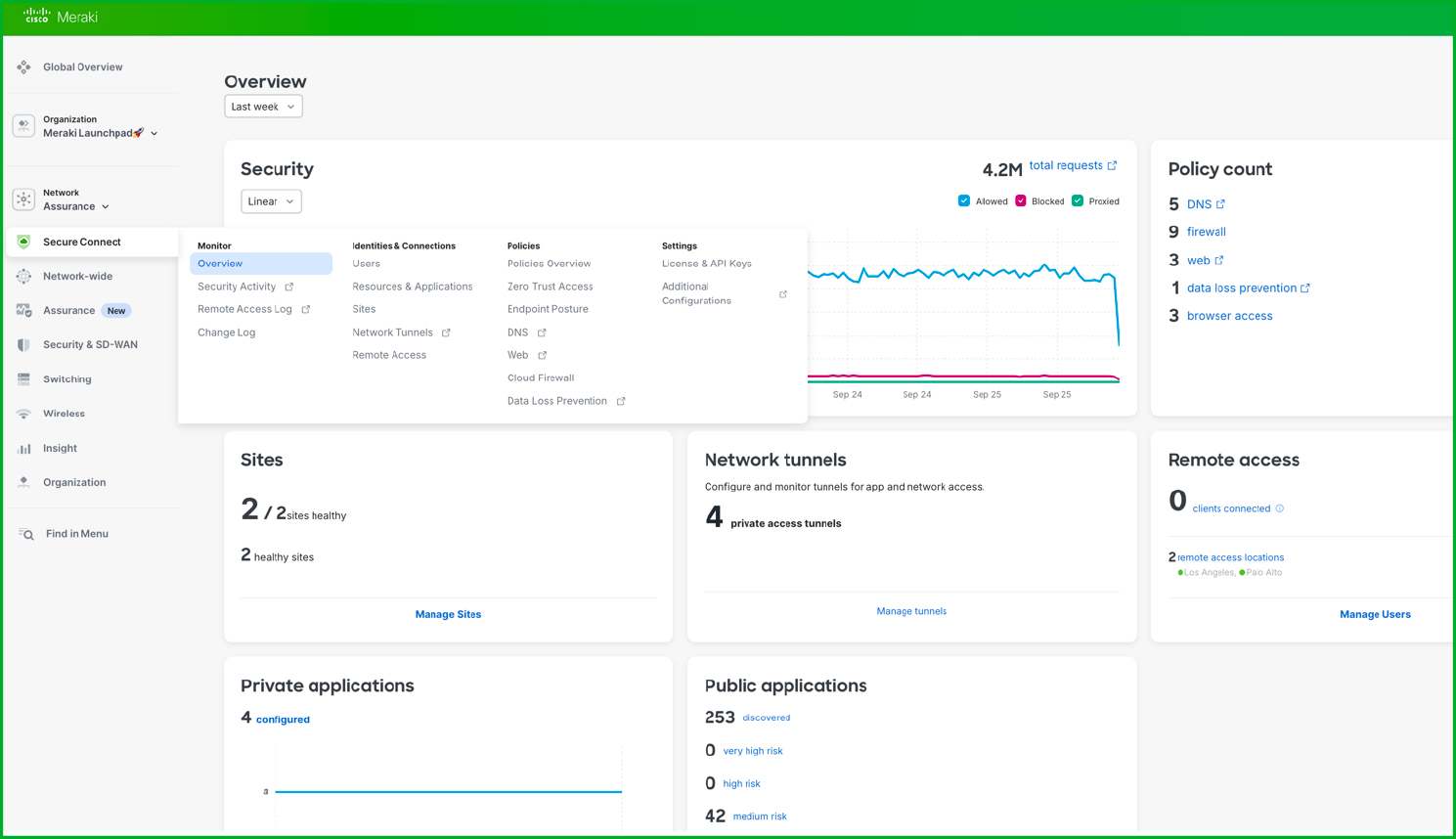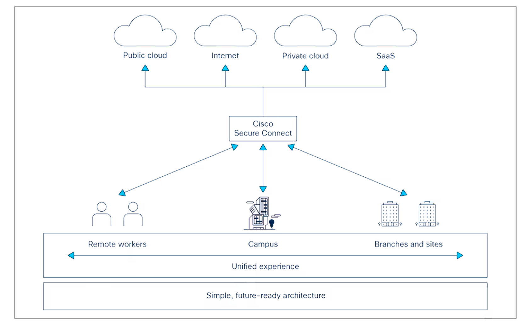 SASE je propojení bezpečnosti a WAN sítě do jedné škálovatelné platformy. Cílem je bezpečný přístup k veřejnému cloudu i místním firemním datům a aplikacím – kdykoliv a odkudkoliv. Propojení lokalit, optimalizaci aplikačního provozu, zajištění funkční a bezpečné WAN sítě má v rámci Secure Connect na starost Meraki SD-WAN. Bezpečnostní funkce jsou poskytovány z cloudu jako SSE (Secure Service Edge) řešení. Pro mobilní klienty je možné využít služby pro vzdálené připojení (VPN as a Service).