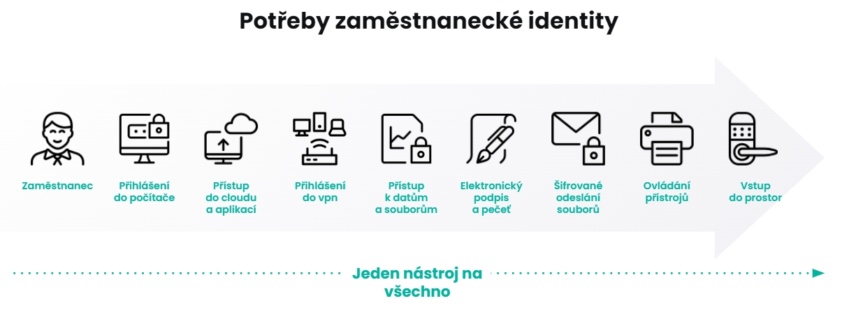 Přihlášení do počítačů a multifaktorová autentizace pomocí USB klíče. K němu se může přidat mobilní aplikace jako další prvek ochrany. USB je kvalifikovaným prostředkem dle EUTL, čip v tokenu umožňuje vytvářet elektronický podpis nejvyšší úrovně.