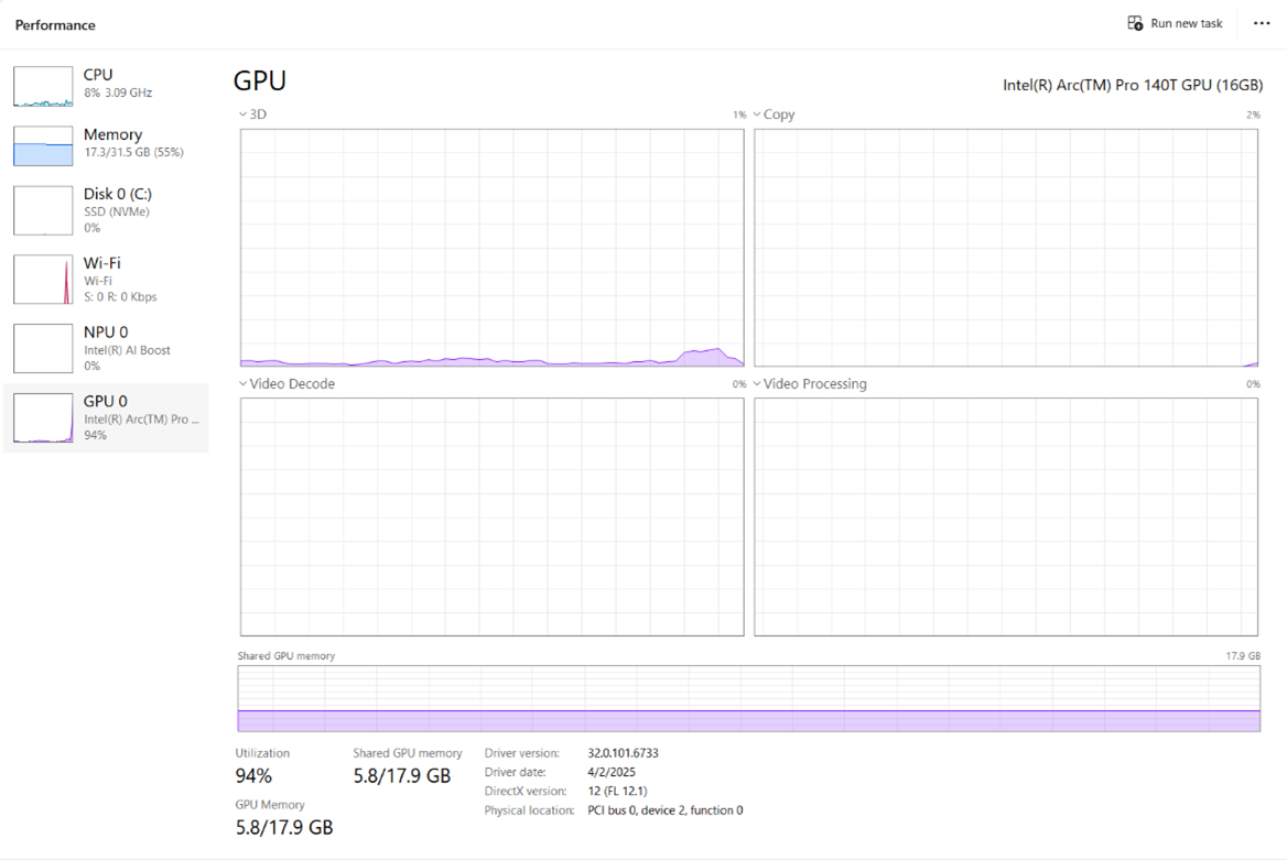Pro tyto potřeby je podstatná grafická karta, která má jak propustnost, tak i dostatek sdílené paměti. Na testovaném Dell stroji se nachází Intel® Arc™ Pro 140 T, která má 16 GB sdílené paměti. I když většina softwarových aplikací je dnes navržena pro Nvidia ekosystém a předpokládá CUDA nebo NVIDIA toolkit, lze na této grafické kartě Intel provozovat modely pomocí dockeru či ollamy speciálně zkompilované pro grafické karty Intel (také v dockeru). Pro testování jsme zprovoznili GPT-OSS Open AI model s 20B parametrů v dockeru. Velikost modelu je 12 GB (kvantizovaný), na grafickou kartu se tedy vejde.