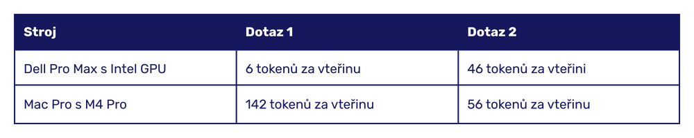 První dotaz byl generován rychlostí 6 tokenů za vteřinu – pro UX to není ideální. Je to dáno nutností model nejprve načíst do paměti. Druhý dotaz byl již generován rychlostí 46 tokenů za vteřinu, což je velmi dobré. Na první odpověď bylo třeba čekat 11 sekund, na druhou 1,5 sekundy.