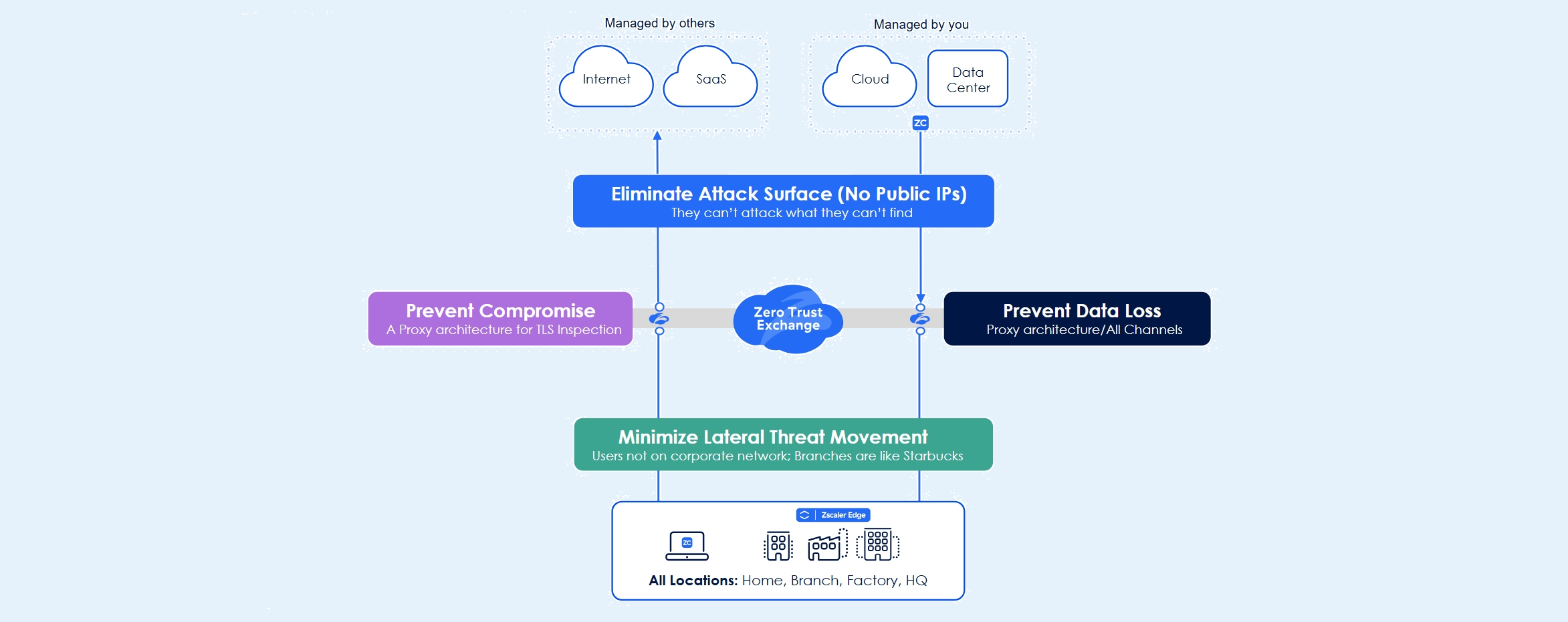 Zscaler nabízí kompletní řešení pro Zero Trust přístup k internetu a firemním aplikacím, ať už se nacházejí v on-premise datacentrech nebo v cloudu. Přístup Zscaleru je výjimečný, protože není postaven na propojování sítí, ale na propojování uživatelů s aplikacemi.