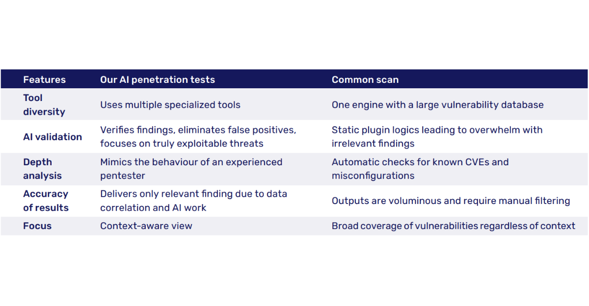 - Validation of vulnerabilities found - ensures only relevant and confirmed findings, eliminating redundancy and noise.